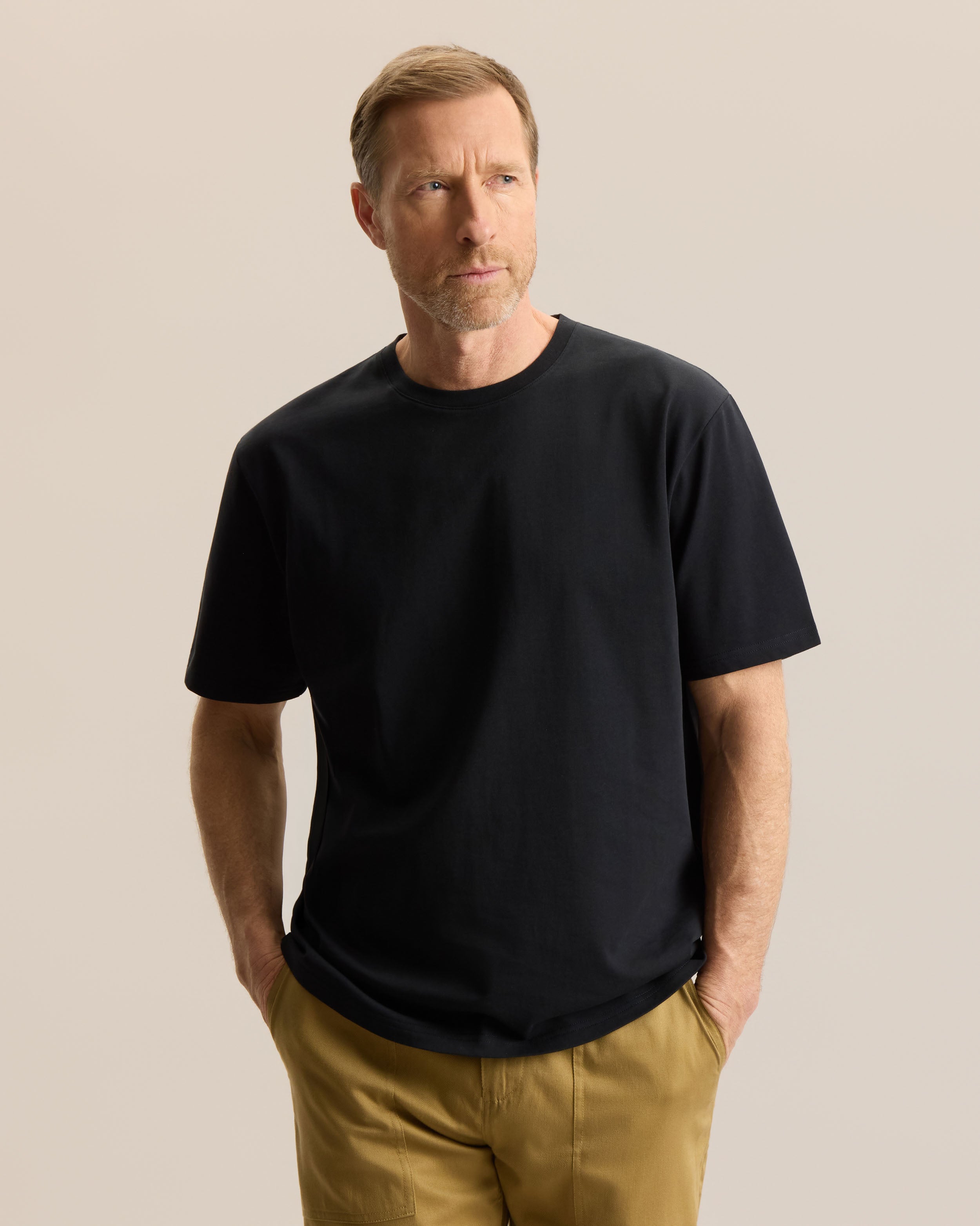 Easygoing and effortless, yet polished enough to wear out, this tee proves that relaxed doesn’t mean sloppy. Cut in a relaxed fit, it drapes naturally for a laid-back silhouette that feels good all day and holds its shape over time. Once considered strictly an undergarment, the T-shirt has evolved into a cultural staple, valued for cotton’s unmatched breathability, natural softness, and hypoallergenic comfort. We designed this one to be worn confidently on its own, crafted in a sturdier 220gsm weight that feels substantial without sacrificing ease. A stay-stitched neckline ensures the collar lies flat and keeps its shape, resisting curling or folding with wear.